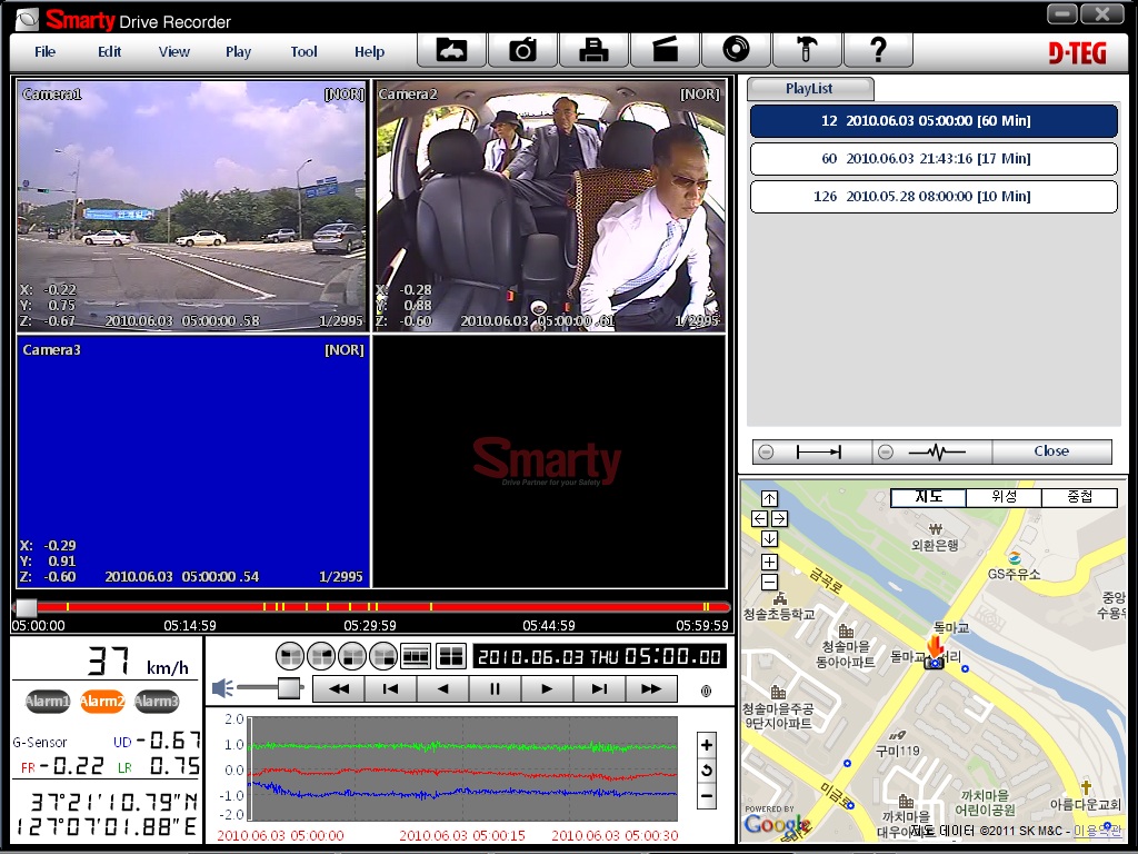 De to medfølgende kameraene har hver sin funksjon. Ett kamera er tiltenkt å filme ut av frontruten og dokumentere det som skjer i front av bilen, mens det andre er utstyrt med IR-lys og er tenkt å dokumentere det som skjer på innsiden av bilen. Begge kameraene filmer i farger og har en kamervinkel på 145°.