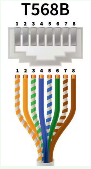 Den vanligste måten å legge opp fargene ser du på bilde. Det er viktig at de åtte lederne ligger på sine riktige plasser, hvis det kablede nettverket skal fungere. Fargerekkefølgen skal være den samme i begge ender av kabelen og den samme som i det stikket du klipper av. Stikket er gjennomsiktig, slik at du kan se hvordan lederne ligger. Den mest vanlige standarden er T568B, eller bare B.