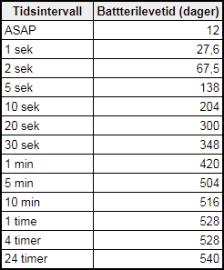 Batterilevetiden er 40 dager mens du tar et bilde hvert 5. minutt med Daylight Scene-innstillingen.